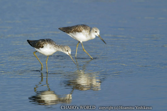 ![]() 2羽並んで餌を探すアオアシシギ |