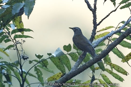| ジョウビタキの声は山の奥の方へ遠ざかり、替わりにエナガ、コゲラがやってきます。ん〜、なかなか林の中から出てきませんねぇ。結局出てこないまま通り過ぎました。ここは我慢です。 しばらくじっと待ってると目の前の木にシロハラっぽい鳥が止まりました。 |