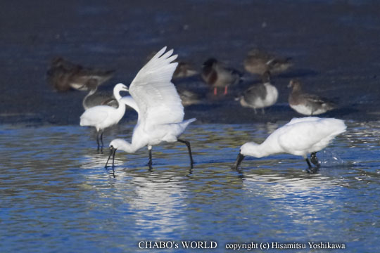 | 今日のフィールドと観察種 ・今津 ・カイツブリ、カワウ、コサギ、ダイサギ、アオサギ、クロツラヘラサギ、マガモ、カルガモ、コガモ、ヒドリガモ、オナガガモ、キンクロハジロ、ホオジロガモ、トビ、ミサゴ、バン、シロチドリ、タゲリ、ダイゼン、ハマシギ、イソシギ、アオアシシギ、ダイシャクシギ、ホウロクシギ、ユリカモメ、ウミネコ、カモメ、カワセミ、ヒヨドリ、モズ、ハクセキレイ、ホオジロ、ホオアカ、スズメ、カワラヒワ、カササギ、ハシボソガラス、ミヤマガラス |
