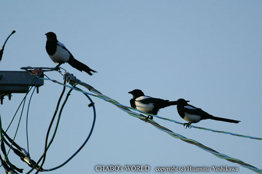 | 堤防へ上がると、ど干潮でして鳥達はバラバラに分散してます。葦の州前にクロツラ4羽が餌を採ってます。あとはマガモ、ヒドリガモなどが上流側、沖の方にはカルガモが屯してます。 コーナーには工事用詰め所が設けてあり、すでに工事の方が数名いらっしゃいます。 少し話をしてもらうと、今日から堤防の通行止めを実施する予定だとか、通行止区間は江の口川水門からコーナーへ向かう途中にあるクリークを渡る橋を過ぎた所からコーナーをとおり、ラジコン飛行場横の田圃へ降りる道路の手前まで。ということでした。皆さん、気を付けましょう。 さてと、一旦車に戻り、水門へ移動します。途中の電線にカササギが7羽並んでたので撮影しようとしたら飛ばれて少なくなっちゃった。(^^; |