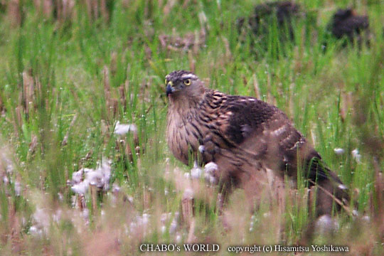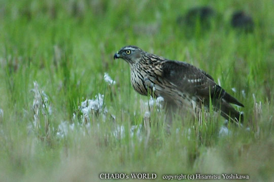 | 天気予報では朝から晴れるとか言ってたのでいつも通り起き出して出撃準備をします。 ふと、外を見るとまだ雨上がりで道路も濡れてるし、電線からは水滴が落ちてます。 ん〜、折角準備したし、山沿いより多少明るいので今津に向かうことにします。 堤防の工事がどうなったか見てみると通行止め区間は江の口川水門の所からになってました。クリークの橋の手前も工事区間みたいです。 まだ始業前なので通ってみると所々に工事資材が置いてありましていつもの散歩の人たちの姿もありません。コーナーから水門へざっと流します。潮は干潮で干潟が広がり鳥達はバラバラです。堤防付近にはマガモ、カルガモ、オナガガモ、ヒドリガモなど。クロツラさんは1羽のみで他は沖の方に出てます。 水門から工場裏へ向かいます。工場裏を移動中、工場横の田圃でトビが何か食べてます。ん?何か変?廻りに羽毛が散らばってます。遠いので回り込んで見るとやはりトビではなさそう。しかし、大きさはトビくらいです。あまり近づいて飛ばれると嫌なので50m程から望遠鏡で観察して吃驚!全体が茶褐色で、太い眉班、胸は黒い縦班・・・オオタカ幼羽 |