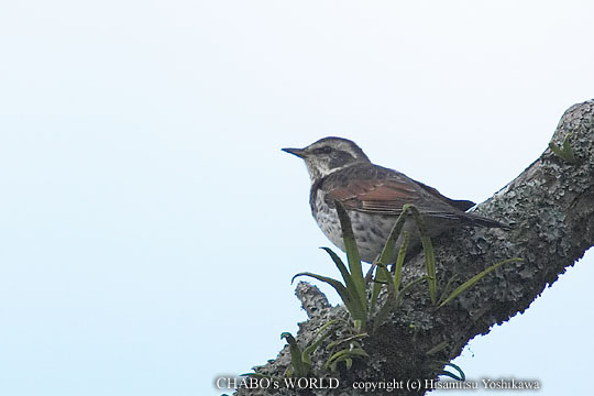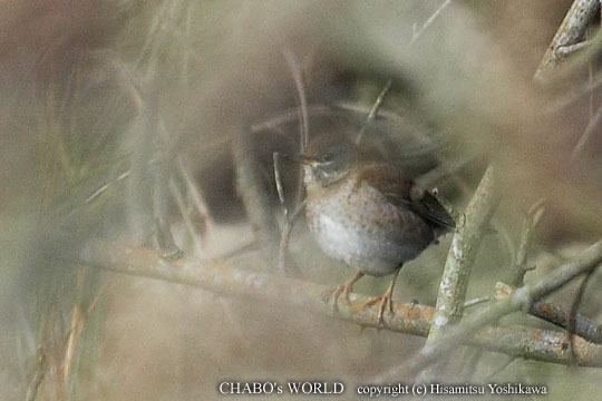 | 8時になったので一旦諦めてグランドの方へ歩きます。神社の廻りの高木にシロハラとツグミが集まってきて追いかけっこが始まりました。縄張り争いでしょうかねぇ? 結局ツグミが追い出され隣の枯れ木に止まります。 |