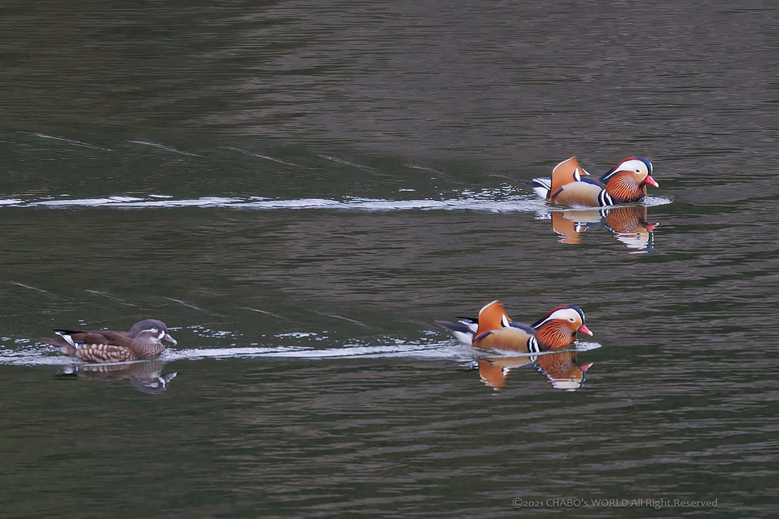 気を取り直して湖面をみると、オシドリが優雅に移動してて、