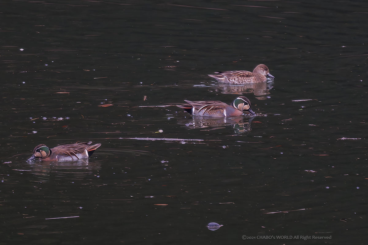 その奥にはトモエガモ20+が水面に浮いた餌を啄んでました。